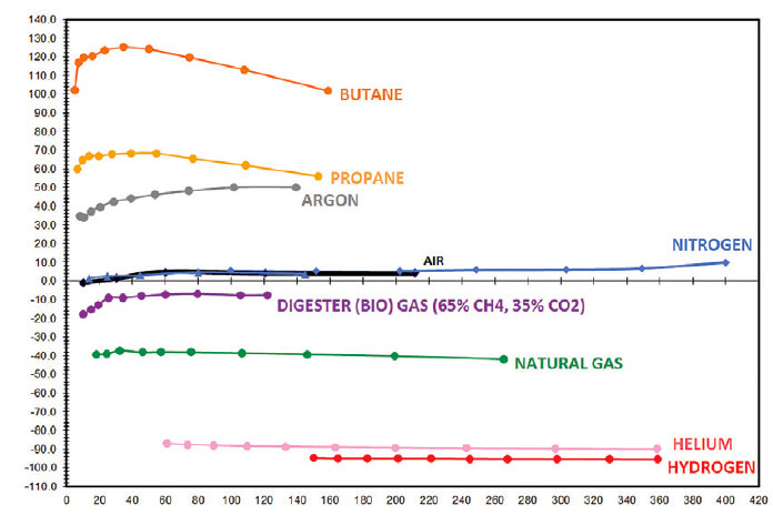 Per illustrare graficamente l’incertezza della misurazione delle calibrazioni simulate, vanno considerate le curve delle prestazioni di accuratezza mostrate nella Figura 1. Queste curve sono state ottenute da un misuratore di portata massico termico prodotto da un fabbricante leader a livello mondiale di misuratori di portata multi-tecnologici, dotato di un menu dei gas selezionabile dall’utilizzatore integrato. È preoccupante vedere la quantità di errori presenti. Ovviamente, questo strumento non è calibrato direttamente in ciascuna di queste composizioni di gas base, ma si limita ad applicare un fattore di correzione dell’algoritmo di equivalenza impreciso. Gli errori maggiori sembrano indicare la semplice correzione di un singolo ordine e il produttore non tenta nemmeno di utilizzare una correzione polinomiale per correggere le non linearità. In gran parte dell’intervallo di portata si nota che queste correzioni, sebbene estremamente ampie nella loro estensione, hanno una certa linearità. Come previsto, le curve di aria e azoto sono relativamente vicine all’offset zero, perché il fluido usato per la calibrazione è l’aria. Quando però lo strumento fa selezionare uno degli altri gas, l’errore di misurazione aggiuntivo dopo l’applicazione del fattore di correzione teorico può arrivare fino a ± 100%! Si può rilevare anche l’incapacità dell’algoritmo di correggere la non linearità per alcuni gas che fluiscono a temperature leggermente elevate. Questo intervallo di non linearità può variare fino al 30%; di conseguenza, un approccio con fattore di correzione, seppur accurato, non verrà applicato all’intero intervallo di portata del fluido.