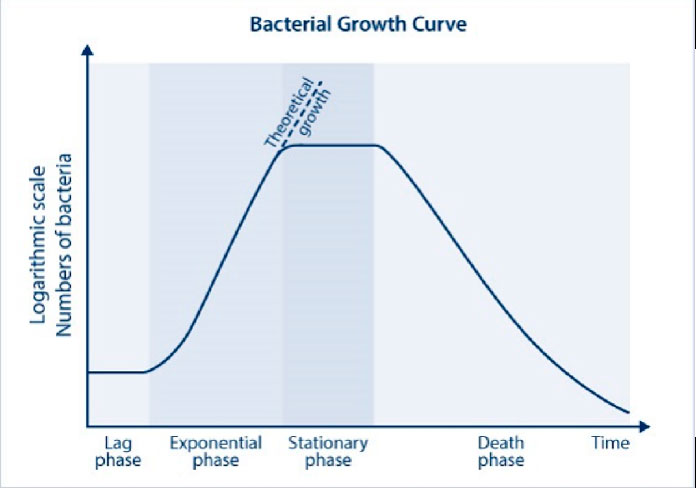La figura mostra la curva di proliferazione ideale di una coltura batterica all’interno di un bioreattore.