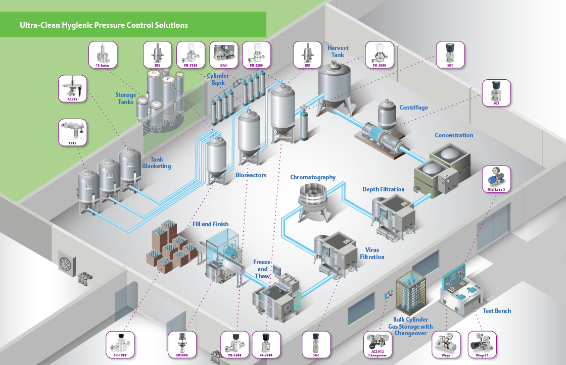 Soluzioni TESCOM per il controllo della pressione, dal più semplice ed economico al più complesso o automatico, progettati tenendo in mente gli standard per le applicazioni ultra-pulite