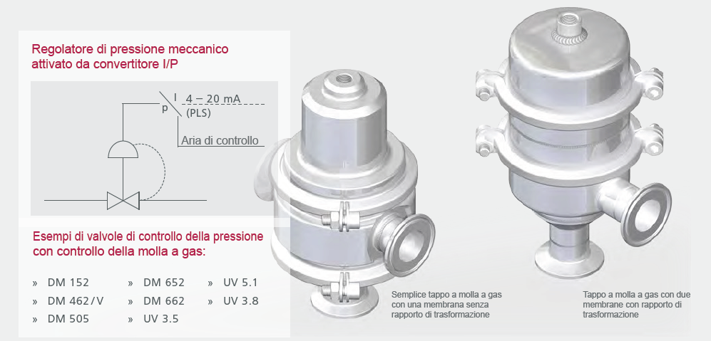 Nel tappo a molla a gas, la pressione impostata viene generata dall’aria pressurizzata che agisce su una membrana. Un convertitore I/P regola la pressione dell’aria di controllo e, in cambio, riceve il segnale da 4 – 20 mA direttamente dal sistema di controllo del processo (PLS) o da un processore nel convertitore I/P. Il dispositivo di regolazione quindi controlla una pressione equivalente alla pressione dell’aria di controllo. A tale scopo, è necessaria la versione con una sola membrana. Per controllare le pressioni di controllo superiori alla pressione dell’aria di controllo erogata, è possibile usare un rapporto di trasformazione. Il rapporto di trasformazione è il risultato dell’uso di due membrane con superfici di controllo di dimensioni diverse. I vantaggi del controllo pneumatico sono la bassa deviazione del controllo, la controllabilità da remoto e l’utilizzo della sovrapposizione della forza della molla meccanica e della molla a gas pressurizzato.