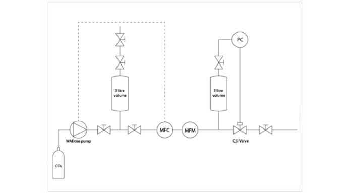 La soluzione di processo per dosare i gas liquefatti consiste in una pompa WADose HP Lite con scambiatore di calore collegato, combinato con un controllore di flusso di massa Coriolis Bronkhorst e un misuratore di pressione EL-PRESS. La funzione dello scambiatore di calore è quella di raffreddare la testa della pompa al di sotto della temperatura di congelamento, per stimolare la formazione di liquido e per prevenire la cavitazione e il degassamento. Ciò serve a evitare variazioni della pressione e un flusso di liquido instabile quando i composti chimici vengono dosati. Come protocollo di comunicazione standard tra la pompa e il controllore di flusso di massa viene usato Flowbus.