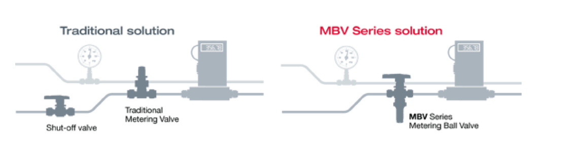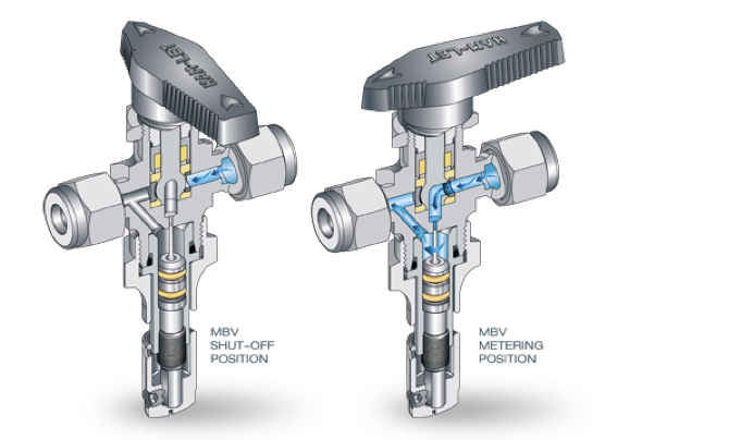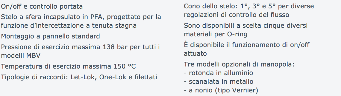 Le valvole di intercetto/regolazione serie MBV offrono la massima accuratezza nella regolazione del flusso per applicazioni a media/bassa pressione. La serie MBV è dotata di un innovativo sistema di intercettazione che consente il pieno controllo del processo, dalla regolazione extra fine fino alla completa chiusura. La possibilità di scegliere fra 3 diverse estremità dello stelo consente la regolazione fino a portate minime (Cv=0.0001) con 11 giri della manopola, permettendo così un controllo estremamente accurato. Grazie alla possibilità di scegliere tra cinque materiali per gli O-ring, la serie MBV offre la migliore compatibilità termica e chimica, rendendola ideale per l’industria chimica e Oil&gas.