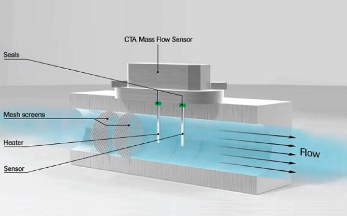 Anziché il principio del bypass, gli strumenti possono anche essere progettati secondo il principio CTA, chiamato anche Anemometria a Temperatura Costante, principio in linea o principio “direct-through”. Questo principio non ha un sensore di bypass ma ha un canale di scorrimento “dritto”. Questa costruzione è meno sensibile all’umidità e alla contaminazione.