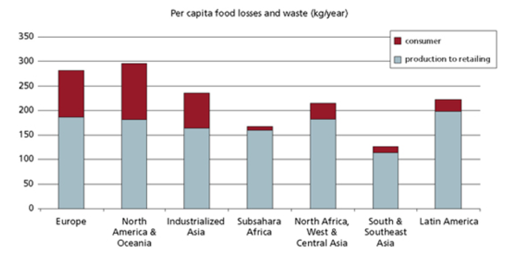 Guardando al seguente grafico delle perdite alimentari e le dichiarazioni di cui sopra, possiamo vedere che vale la pena investire nelle tecniche di produzione, per aumentare potenzialmente la conservazione degli alimenti confezionati. Questo avrebbe un impatto positivo sullo spreco di cibo nei paesi sviluppati.