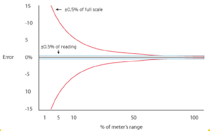 In generale si può dire che più bassa è la percentuale, più accurato è il misuratore di portata. Tuttavia, questo dipende anche dalla specifica di FS (Fondo Scala) o Rd (Lettura). Il significato di Vasta Scala e Lettura sarà spiegato più avanti in questo blog.