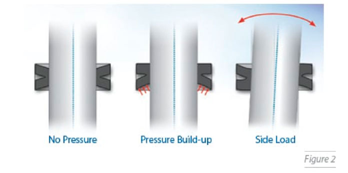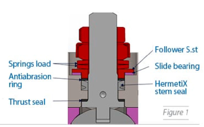 Una caratteristica speciale di questo design è una guarnizione chiamata HermetiX, che ha un design simmetrico che ricorda la lettera X e ha un’eccellente adattabilità alle superfici di tenuta e alle varie forze e pressioni esterne. Per esempio, la guarnizione si comporta ugualmente bene sia quando c’è pressione interna nella valvola sia quando l’operatore agisce meccanicamente sullo stelo, causando carichi laterali (vedi Figura 2).