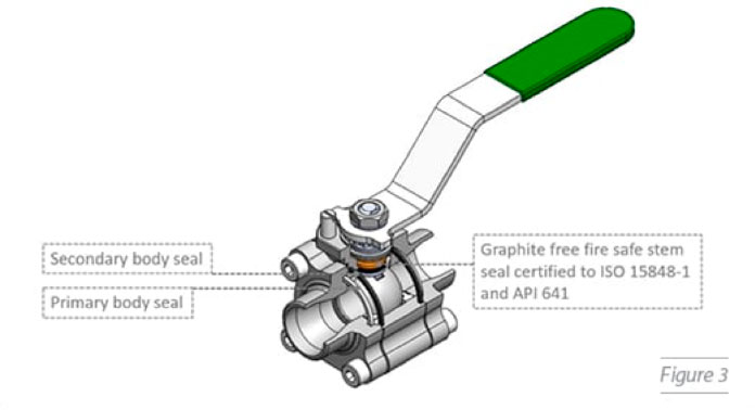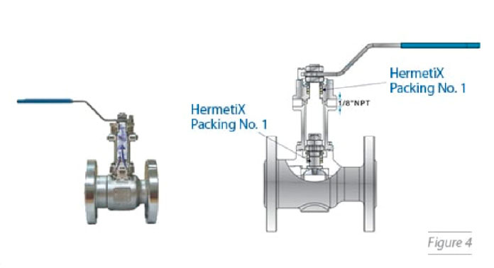 Nel caso in cui le FE siano limitate a 50ppm attraverso lo stelo dall’impianto (equivalente a un livello di tenuta Bellow), le valvole aziendali possono essere dotate di un dispositivo opzionale che agisce come una seconda barriera per l’emissione. Il dispositivo mostrato nella Figura 4, è un ulteriore bonnet con uno stelo che trasferisce la rotazione allo stelo della valvola principale, fissato ermeticamente alla valvola. Come per lo stelo principale, lo stelo del dispositivo è protetto dal sistema di guarnizioni. Connessioni aggiuntive da 1/8 di pollice permettono di collegare una varietà di apparecchiature, come sensori e manometri che segnalano la presenza di una perdita attraverso lo stelo principale.