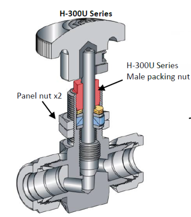 - Tempo di vita maggiore del prodotto e buon rapporto costi/efficacia – La rimozione del meccanismo di tenuta della valvola potrà influire in modo casuale sulla compressione ed espansione del materiale di tenuta. Questo comporterà una tenuta ottimale della guarnizione e una durata maggiore. Inoltre, un’installazione errata del dado di sicurezza potrebbe comportare un disallineamento, che potrebbe causare una perdita dalla sede e danni alla filettatura dello stelo. La serie H-300U elimina il problema consentendo una pannellatura facile e sicura, in grado di mantenere intatte le prestazioni originali della valvola.