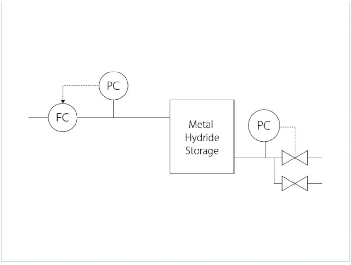 Nei serbatoi di idruro metallico, l’idrogeno viene immagazzinato grazie alle reazioni chimiche reversibili che avvengono tra una lega metallica e l’idrogeno gassoso. L’idruro metallico solido agisce come una spugna in grado di assorbire e rilasciare idrogeno. Per individuare in quali condizioni di processo il carico/scarico di idrogeno risulti più efficace, è necessario misurare e controllare accuratamente i flussi di idrogeno e la pressione di processo. Inoltre, trattandosi di ambienti di ricerca e sviluppo, i setpoint e i valori di misurazione devono essere accuratamente registrati per fini analitici.