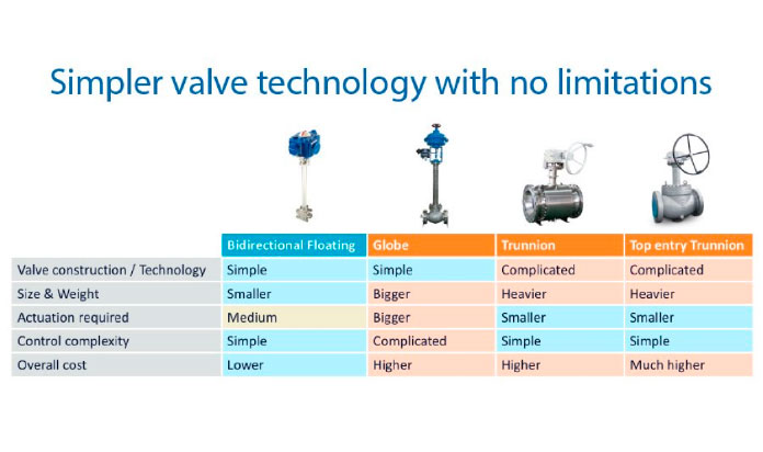 La tabella seguente mostra i vantaggi delle valvole a sfera flottanti bidirezionali HABONIM rispetto alle altre tre tecnologie: a globo, trunnion e trunnion top entry. La struttura e la tecnologia semplificate, le dimensioni più compatte, il peso ridotto, il minore livello di complessità e i costi più contenuti dell’intero sistema rendono questa valvola ideale per l’uso in applicazioni criogeniche come le imbarcazioni LNG e da rifornimento.
