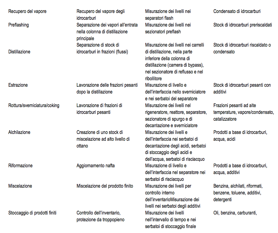 La variabilità delle fonti e della qualità degli stock e la necessità di regolazioni flessibili, rapide ed economiche richiedono strumenti di regolazione in grado di gestire diversi tipi di liquidi all’interno dello stesso serbatoio e di garantire misurazioni di livello accurate e affidabili. Questo è particolarmente vero per il flusso degli stock e per i vari serbatoi di stoccaggio e di processo delle diverse sostanze chimiche utilizzate nel processo di raffinazione. La presenza di liquidi diversi all’interno del serbatoio provoca una variazione delle proprietà dei liquidi misurati. Pertanto, proprietà come densità, viscosità, infiammabilità, temperatura e pressione di stoccaggio, costante dielettrica e altre varieranno nel prodotto. Questa condizione richiede un livello di misurazione universale che sia immune alle variazioni di prodotto e che permetta un adattamento rapido e coerente al processo.