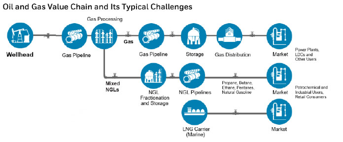 Questo settore è caratterizzato da una lunga catena di valore, che inizia dalla testa del pozzo in vengono estratti il petrolio grezzo e i gas da un serbatoio sotterraneo e trasportati a un’unità di trasformazione del gas, in cui i gas vengono separati e compressi.